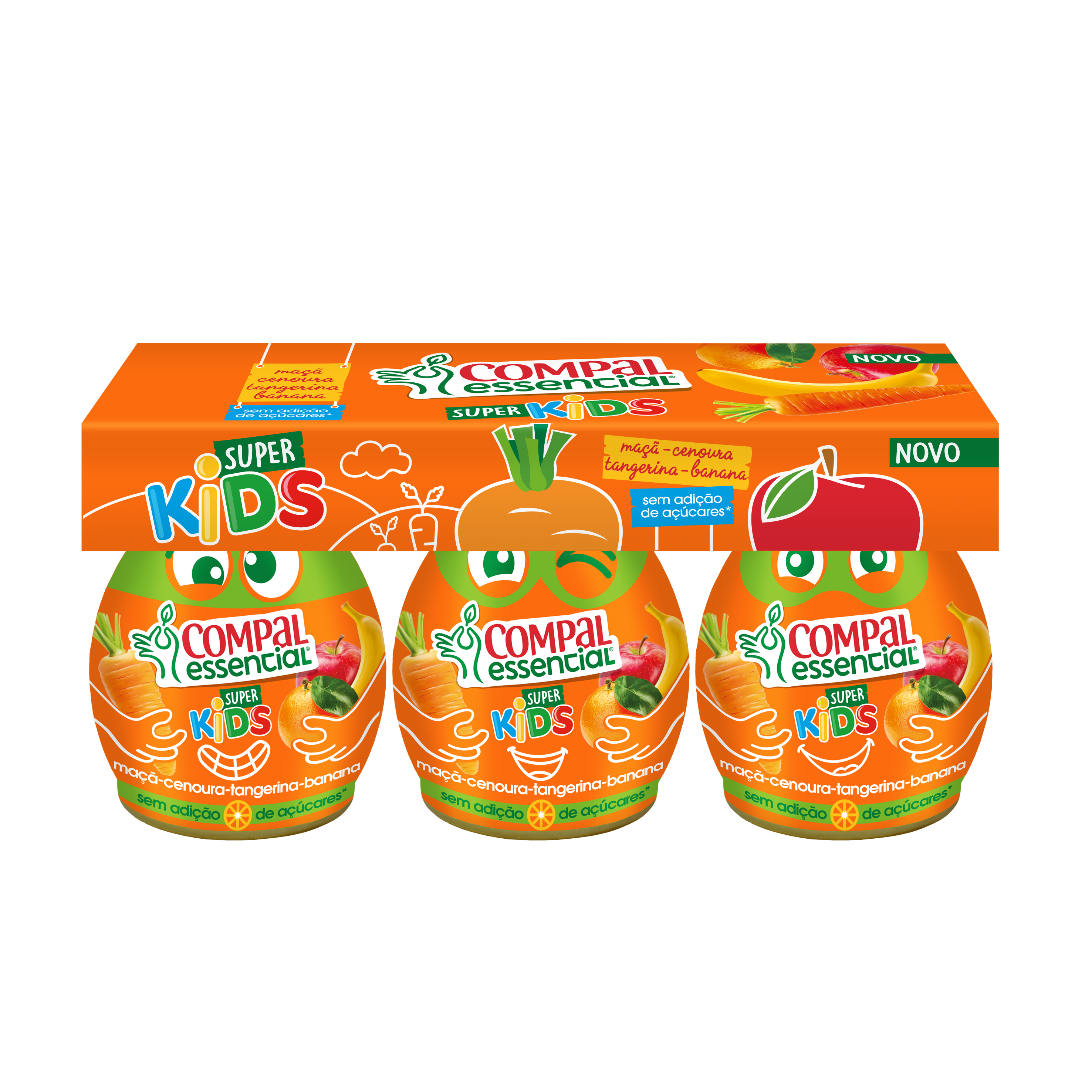 Este novo Compal Essencial Super Kids combina frutas (maçã, banana e tangerina) com hortícolas (cenoura), sem adição de açúcares. Além disso, destaca-se por ser fonte de fibra. Simples e delicioso, é a escolha perfeita para uma Super Criança.